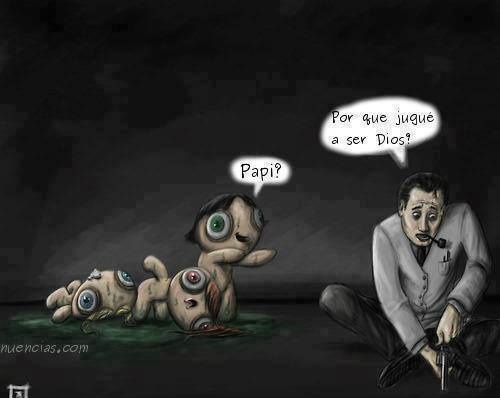 La locura estimuló al profesor tomar un bisturí para deshacerse de aquellas monstruosidades. Logró asestarles en la cabeza, pero antes de siquiera volver a comenzar con un nuevo experimento, dudó en hacerlo.
